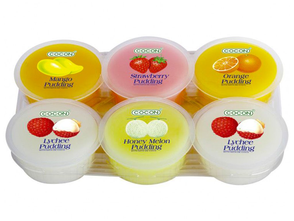 Balení lahodných kokosových pudinků obsahuje příchutě jako jsou Mango, Jahoda, Pomeranč, Liči a Medový meloun.